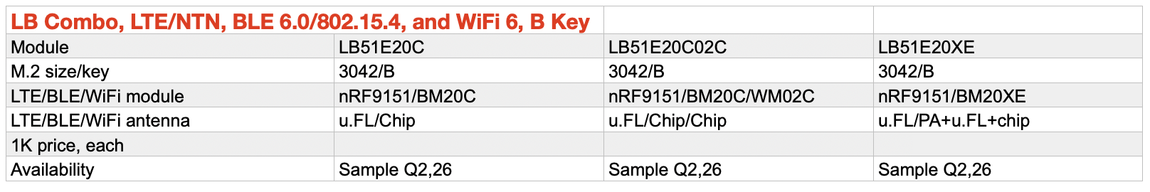LB51E20C02C, nRF9151 LTE/NTN,nRF54LM20A BLE6.0, nRF7002 WiFi 6 Combo Modules